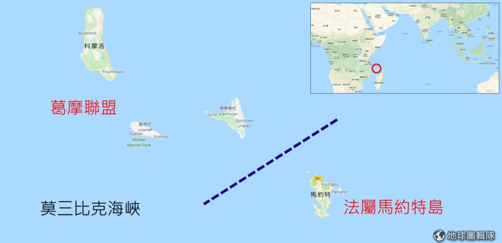 圖為法屬馬約特島和鄰近的葛摩聯盟相對位置。葛摩聯盟在 1975年脫離法國獨立,然而馬約特人卻希望留在法國,做為法國的一省。