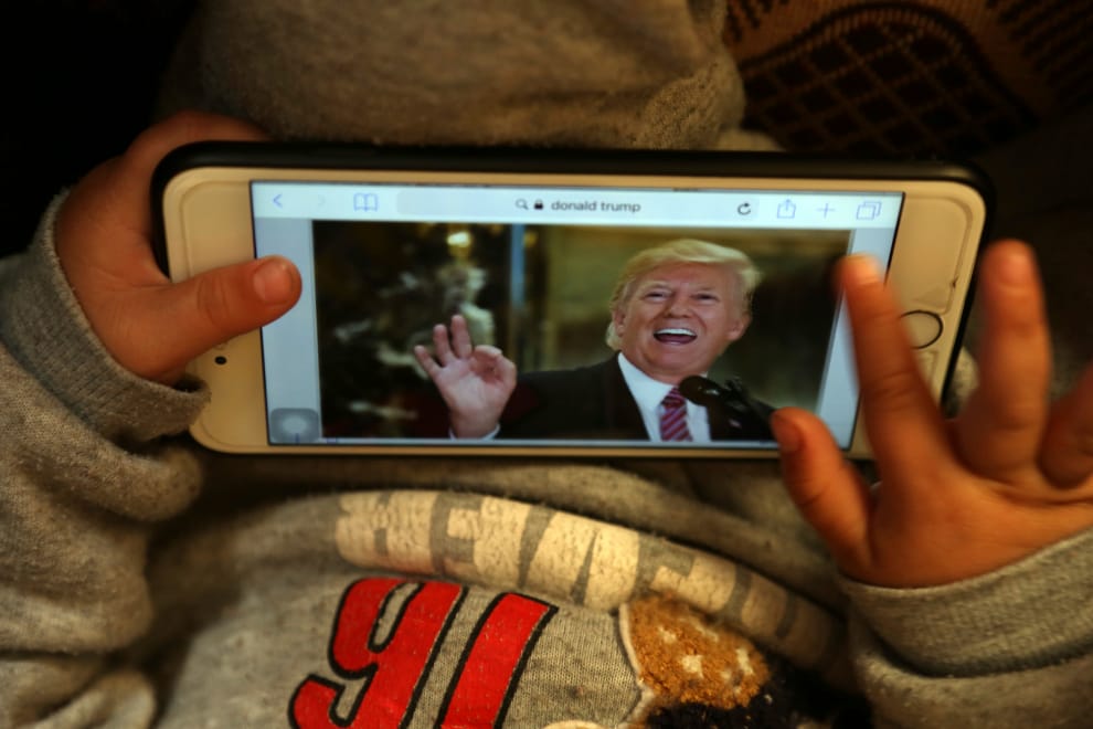 唐納川普正在用手機觀看唐納川普的演講。