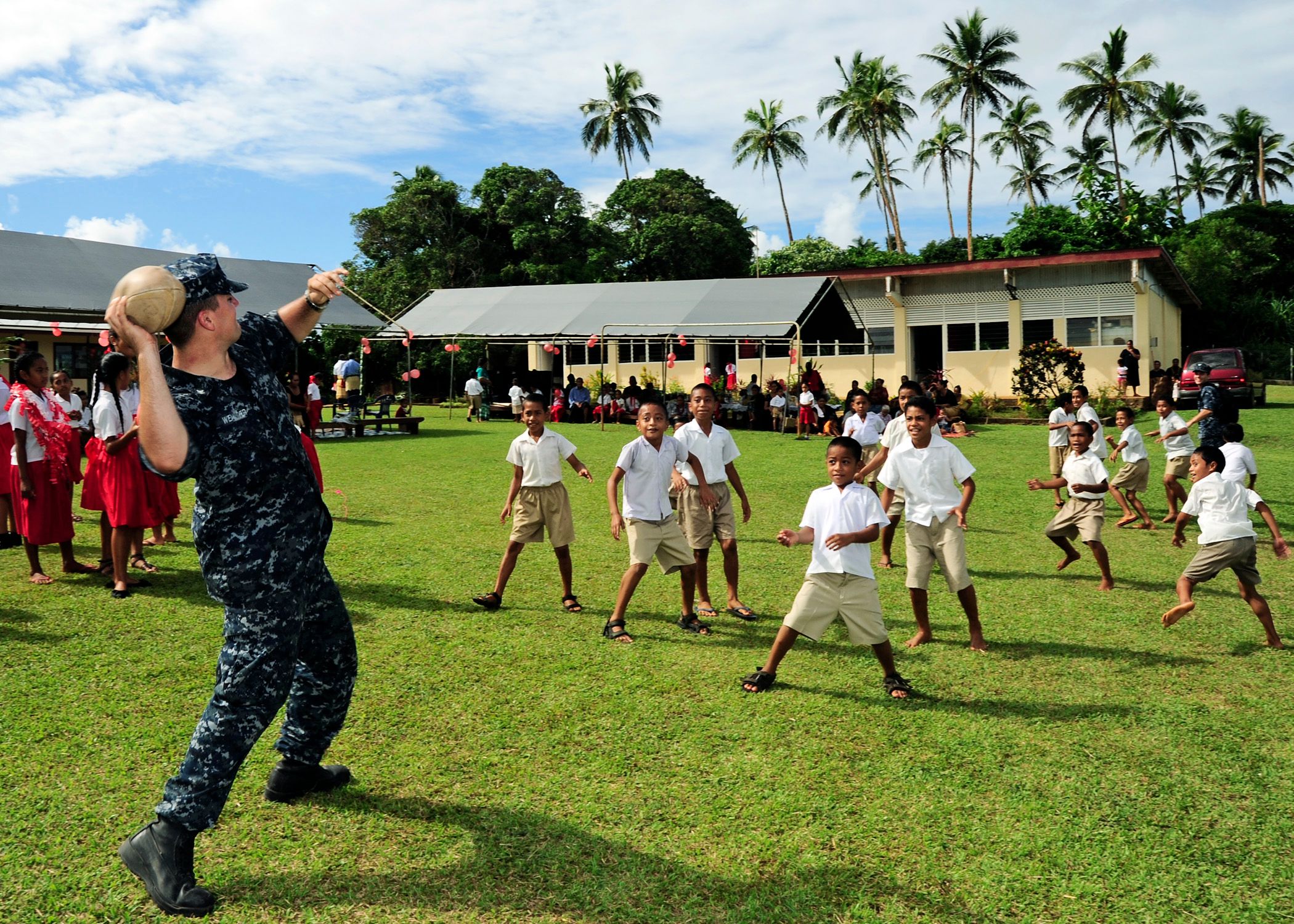 這個月,東加的教育部發函給公立學校,禁止女學生在學校打橄欖球或拳擊。圖為 2011年4月,一名美國空軍和東加的小孩們一起玩橄欖球。