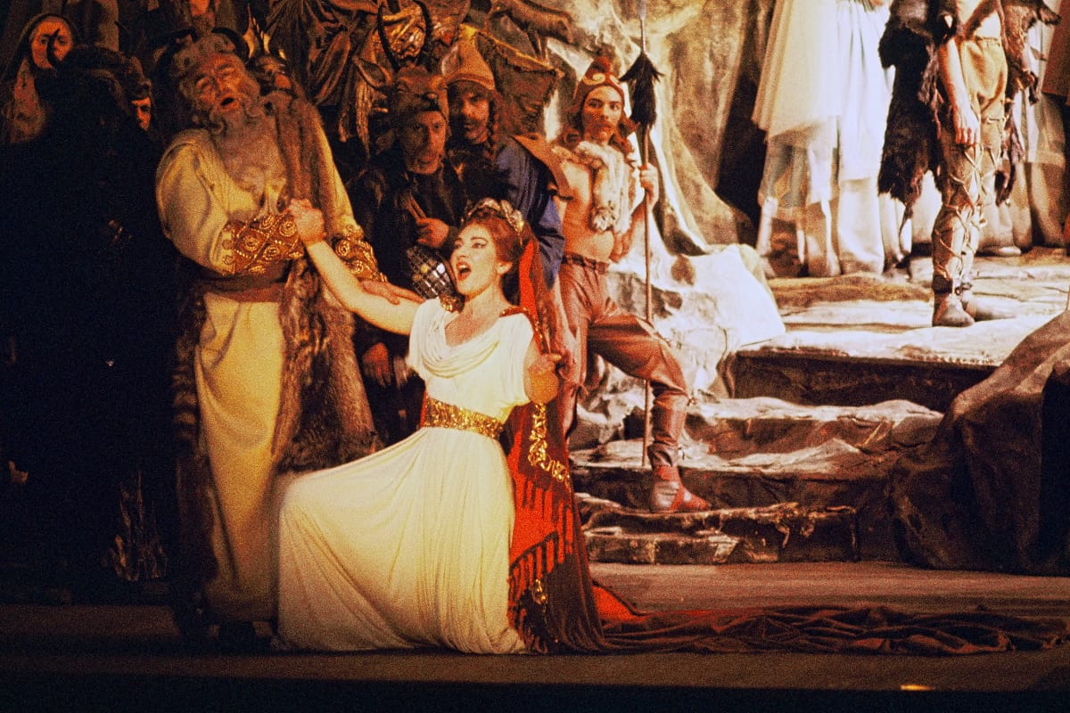 圖為在舞台上表演的卡拉絲,她憑著驚人的才華復興了義大利美聲唱法。