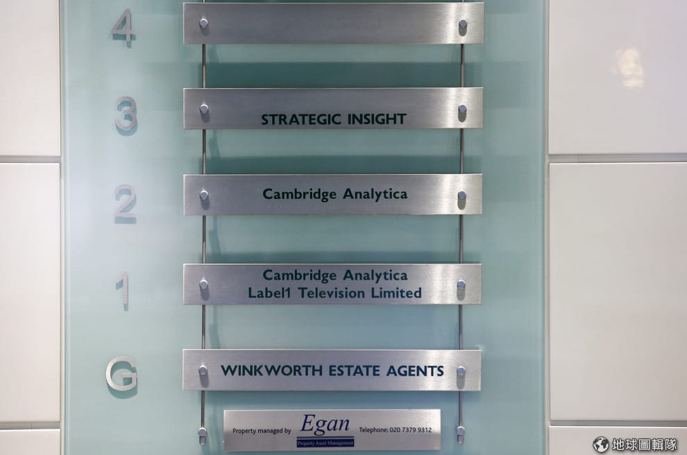 圖為「劍橋分析」位於倫敦辦公室的樓層介紹。《衛報》指出,他們的消息來源包含「劍橋分析」的前任或現任員工、學者、律師。