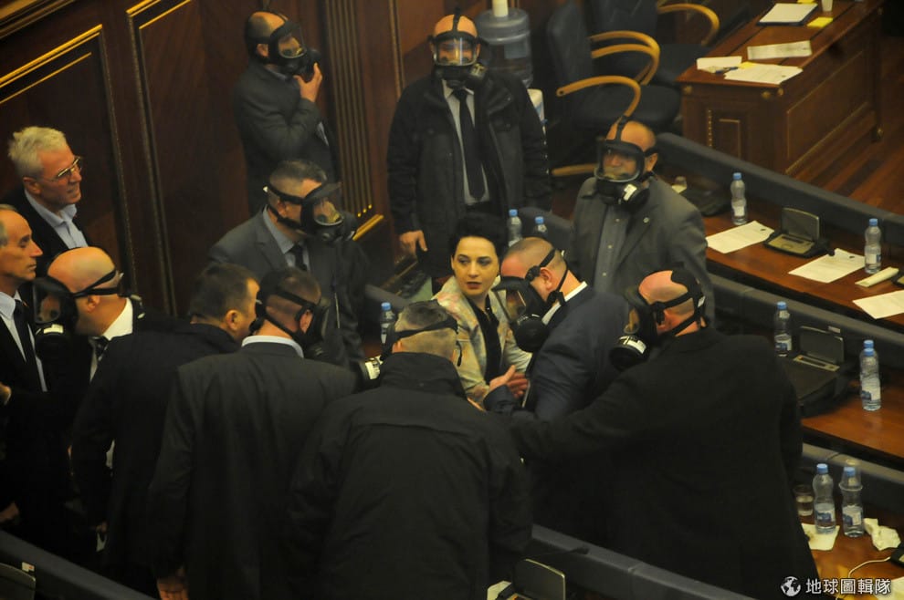 圖為昨日(21),科索沃議會上因為催淚瓦斯煙幕瀰漫,議員們趕緊逃離現場。