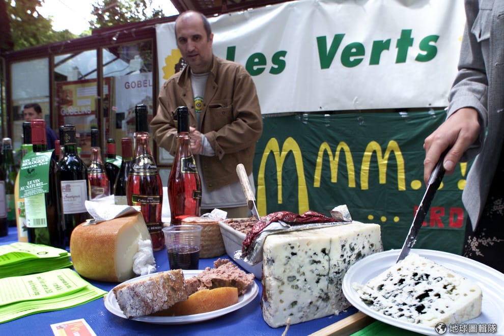 2010年7月,綠黨的成員在預定成為麥當勞的分店門口發放藍起司、紅酒,還有麵包,抗議這家麥當勞即將成為巴黎第 46家分店。