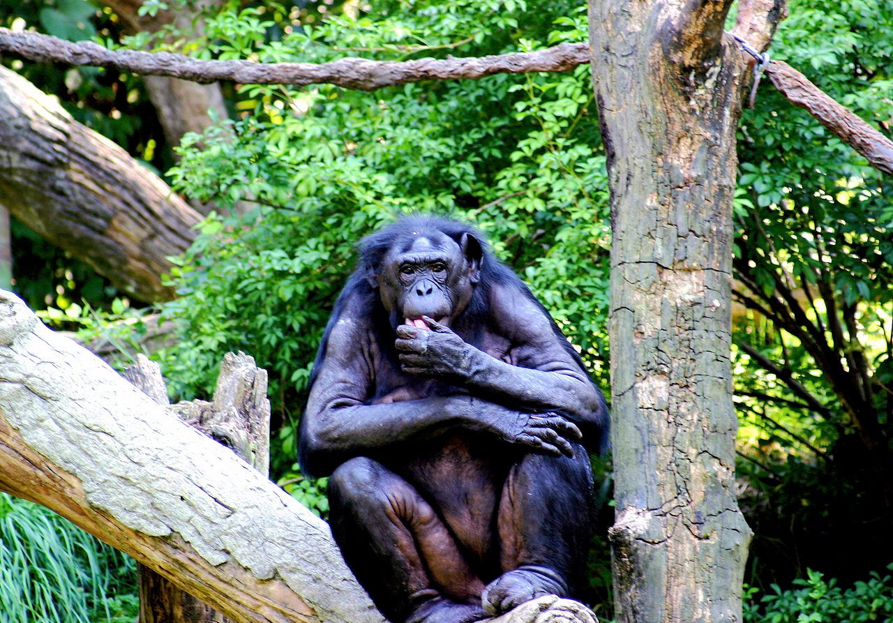 一隻倭黑猩猩坐在樹梢上休息。其實牠也和前面提到的大象一樣,會有一些自療行為。