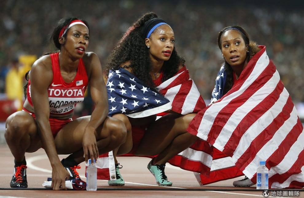 在這張美國田徑選手比賽的照片中可以看到,她們蹲下時腳後跟會抬起來,這與「亞洲蹲」腳掌整個貼地的蹲法不同。