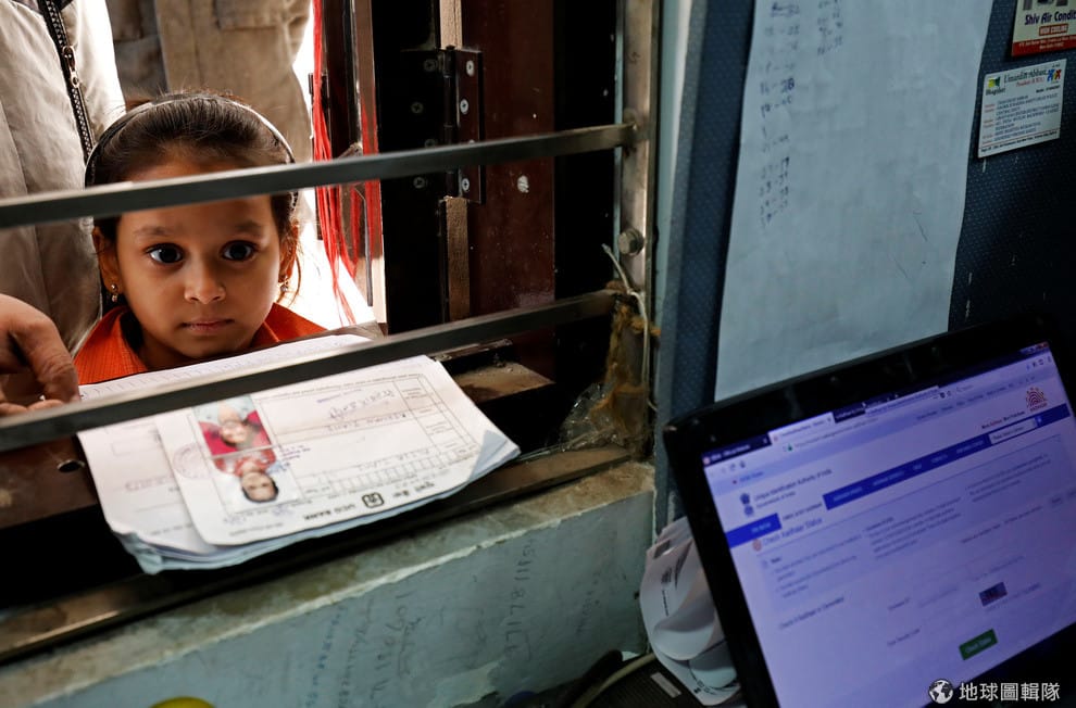 在印度新德里,一名父親帶著小女孩來為自家人申辦Aadhaar。