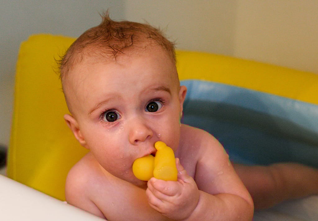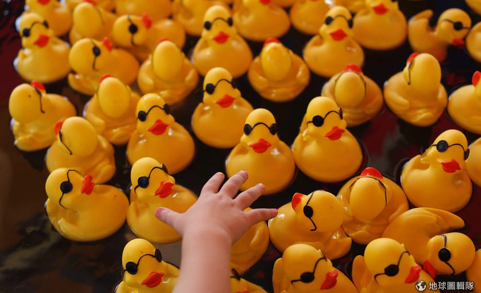 小朋友伸出一隻手,想要和黃色小鴨們玩。最近一項研究發現,塑膠製的洗澡玩具對於微生物來說就像天堂一樣。
