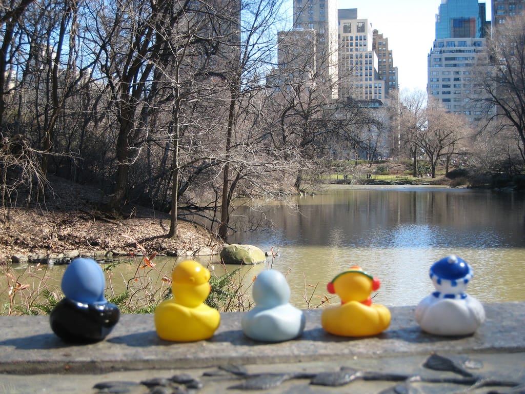 在紐約中央公園的橋墩上,五隻塑膠小鴨望著水面。