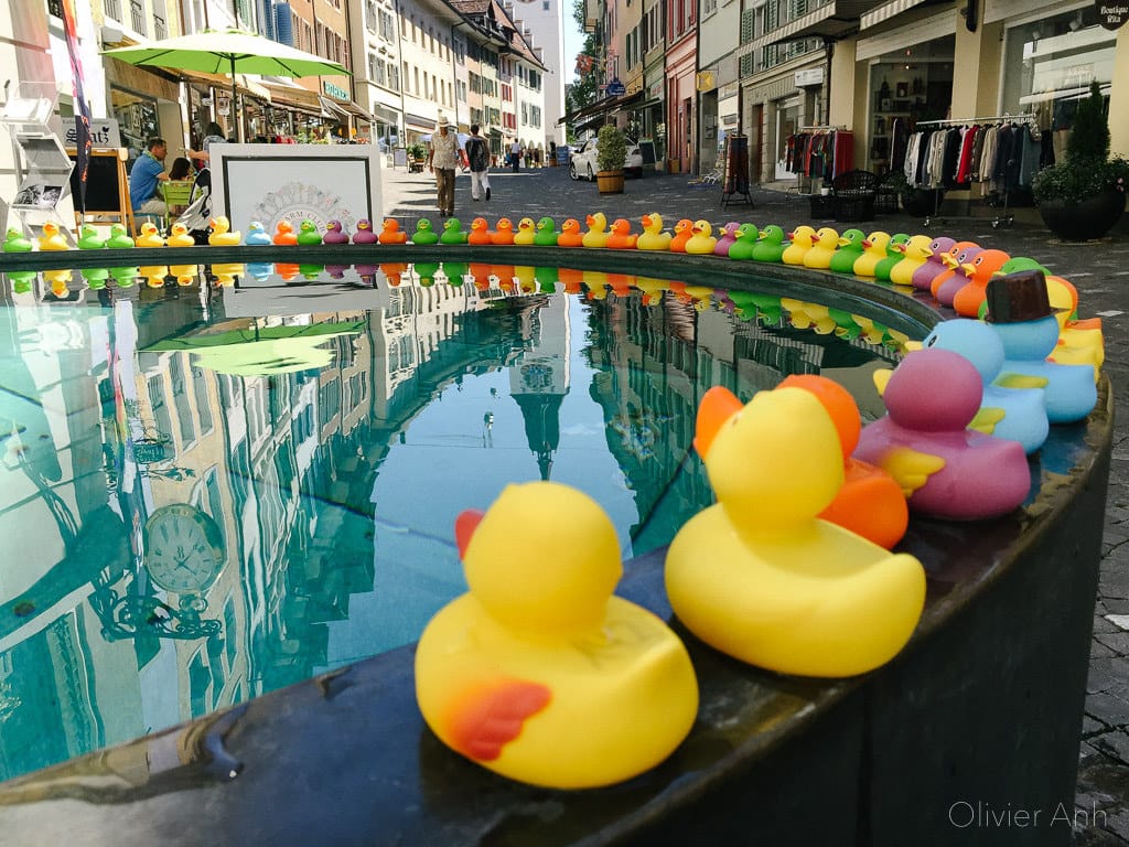 圖為瑞士布雷姆加滕(Bremgarten)的一個水池,各種顏色的塑膠小鴨排排站。