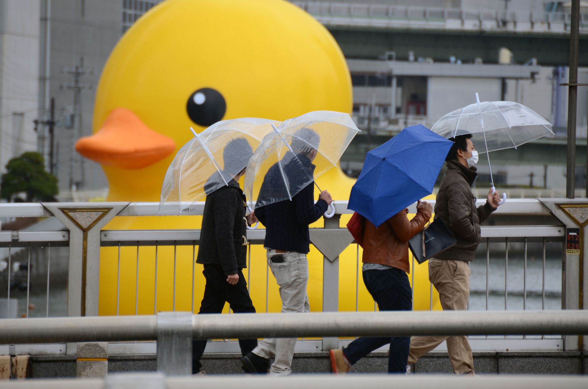 圖為 2013年冬天,在日本大阪的堂島川上,四名撐著傘的男生從黃色小鴨旁邊走過去。