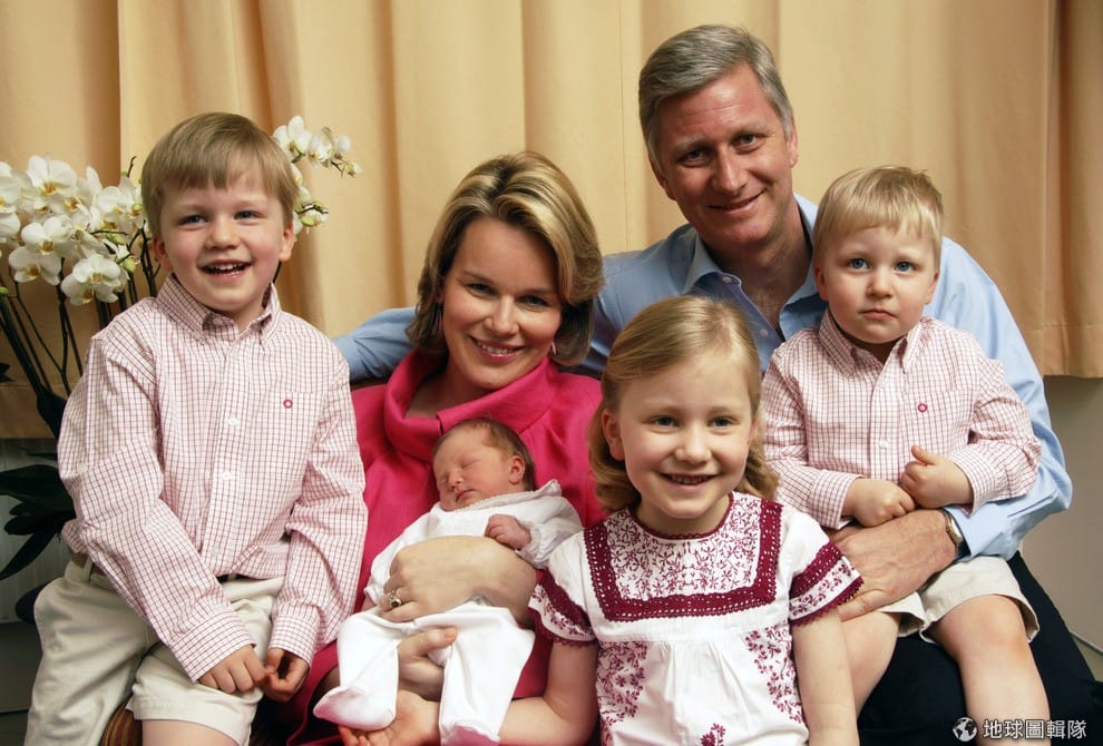比利時的菲利浦王子(Crown Prince Philippe)和太太瑪修德公主(Princess Mathilde)抱著剛出生的艾雷諾小公主與其他三位孩子(左到右)蓋伯(Gabriel)、伊莉莎白(Elisabeth)、愛瑪努(Emmanue)。