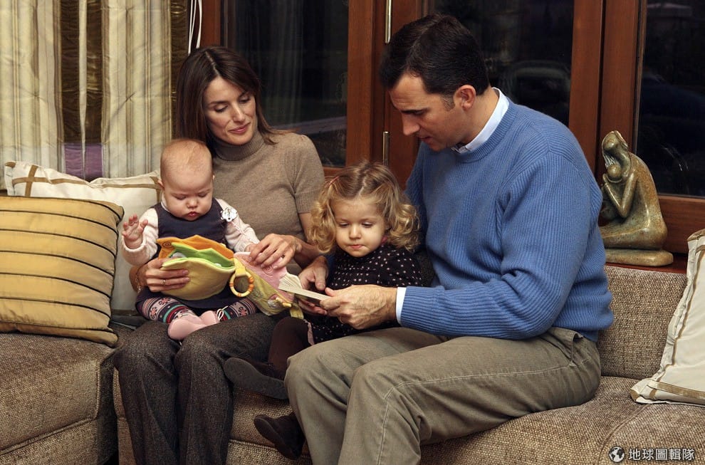 西班牙菲利浦王子(Crown Prince Felipe)和他的太太萊提茲雅公主(Princess Letizia)一起抱著小公主蘇菲亞(左邊)以及蕾諾兒(中間)。