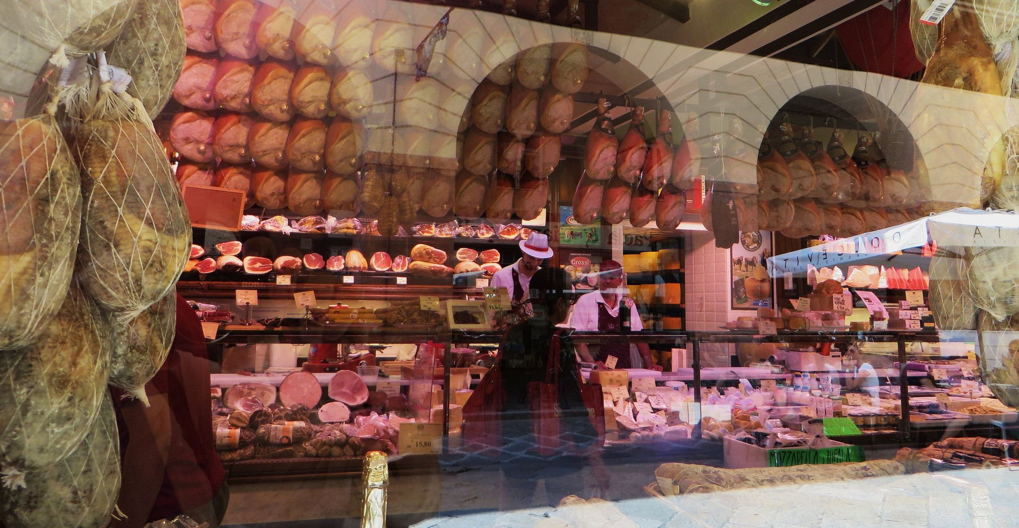 圖為義大利一家肉店,店內販售了各式各樣的火腿。