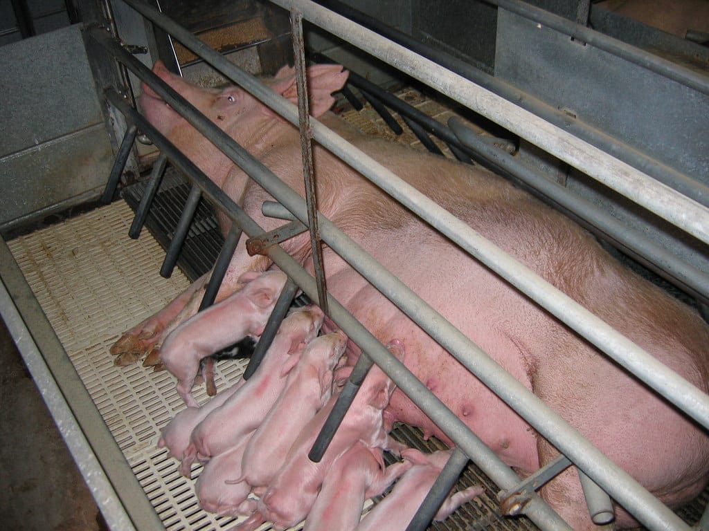 圖為一隻母豬被關在親子箱裡,小豬們爭相在豬媽媽身邊吸奶。這種親子箱可以讓豬媽媽和小豬們一起生活,卻又不會讓豬媽媽一個不小心壓到小豬。