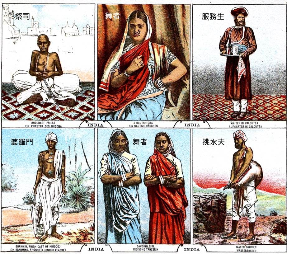 在 1888年,由莫蘭(George Moerlein)繪製的《世界之旅》(暫譯,A trip around the world)繪本中,描繪出了印度高階種姓婆羅門的樣貌(圖左下)。