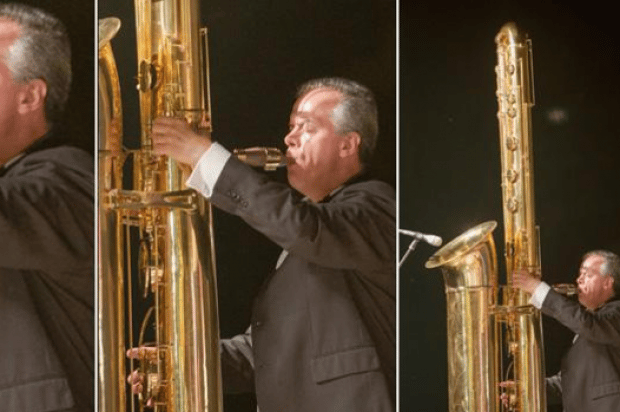 一名男子正在演奏比他還要高的薩克斯風。