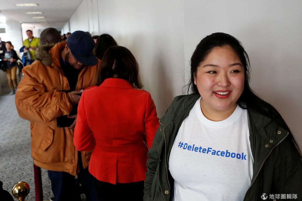 在德克森參議院大樓內,人們排隊等著看Facebook執行長祖克伯參加聽證會。一名女子身上穿了一件寫著響應「#刪除Facebook」運動的T恤。