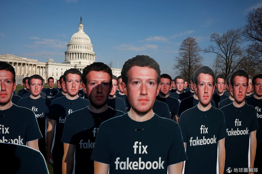在美國華府國會山莊外,抵制Facebook的團體Avaaz.org擺上了一面面Facebook執行長祖克伯的人形立牌,要求他好好修正Facebook的一切。