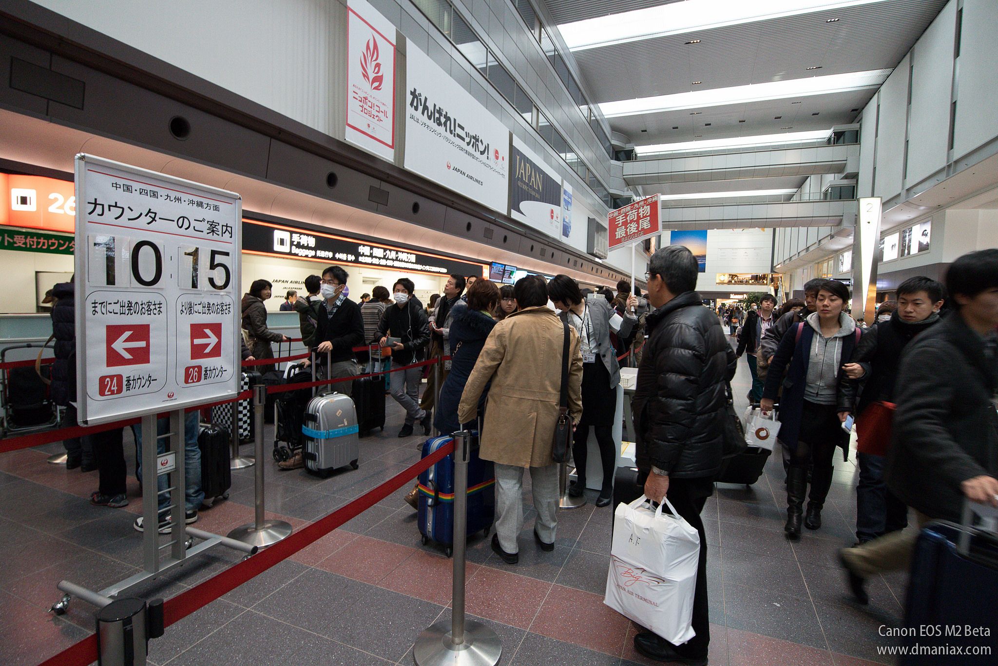 圖為日本羽田機場的國內線航廈,旅客們拎著行李在櫃檯前準備報到。