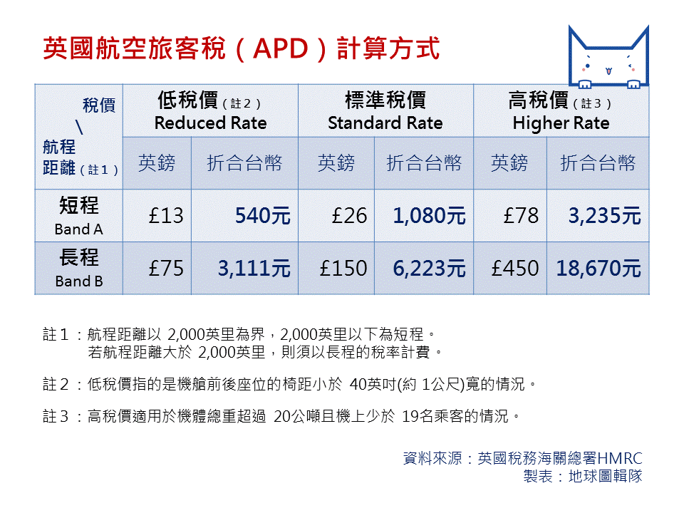 英國的「航空旅客稅」(Air Passenger Duty)最特別的地方在於,會依據航程和座艙有不同的收費標準。航線以 2,000英里(約 3,218公里)為分界,航程大於 2,000英里的航班,需要支付更高額的稅金。
