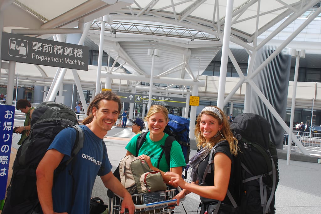 明年起,從日本出境的人都必須要繳納「出國稅」,這筆稅收將用來整備日本國內的公共觀光設施。圖為三名遊客抵達東京成田機場後,開心地合影。