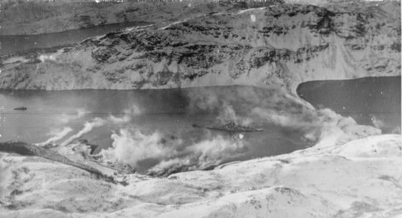 當時,船上載有 2,500名船員的「鐵必制號戰艦」撤退到了挪威北方的峽灣,藉此躲避同盟國的攻擊。然而,「鐵必制號戰艦」最後還是被同盟國的轟炸機發現。於是,納粹德國在「鐵必制號戰艦」上釋放大量的化學煙霧,想辦法讓船艦消失在轟炸機的視線裡。