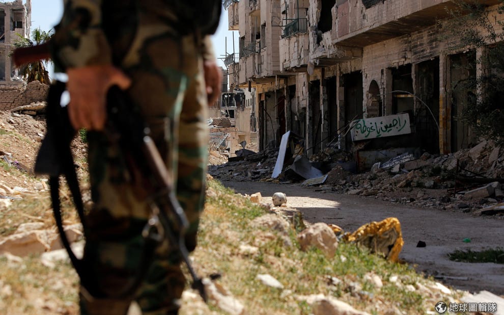 在原本由敘利亞反政府軍控制的東烏塔區,一名政府軍站在寫著「我們會重返烏塔」的標語前。康塔爾當初之所以離開敘利亞,為的就是不想要加入政府軍。