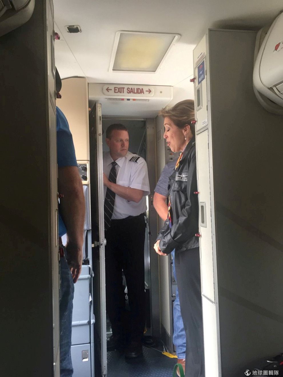 圖為機長舒茲(Tams Tammin Jo Shults)和機組員在 1380號班機上。外界認為,機長在短時間內冷靜做出最適當的處理,才能讓整起事故的災害降至最低。