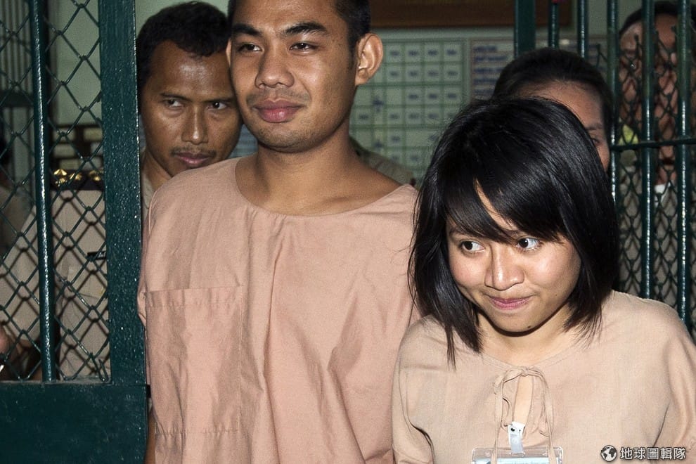 圖為 2015年,曼空(右)和先延(左)因為《狼新娘》這齣嘲諷劇,遭到泰國軍政府判刑兩年半。他們兩人先後在 2016年8月獲得大赦。