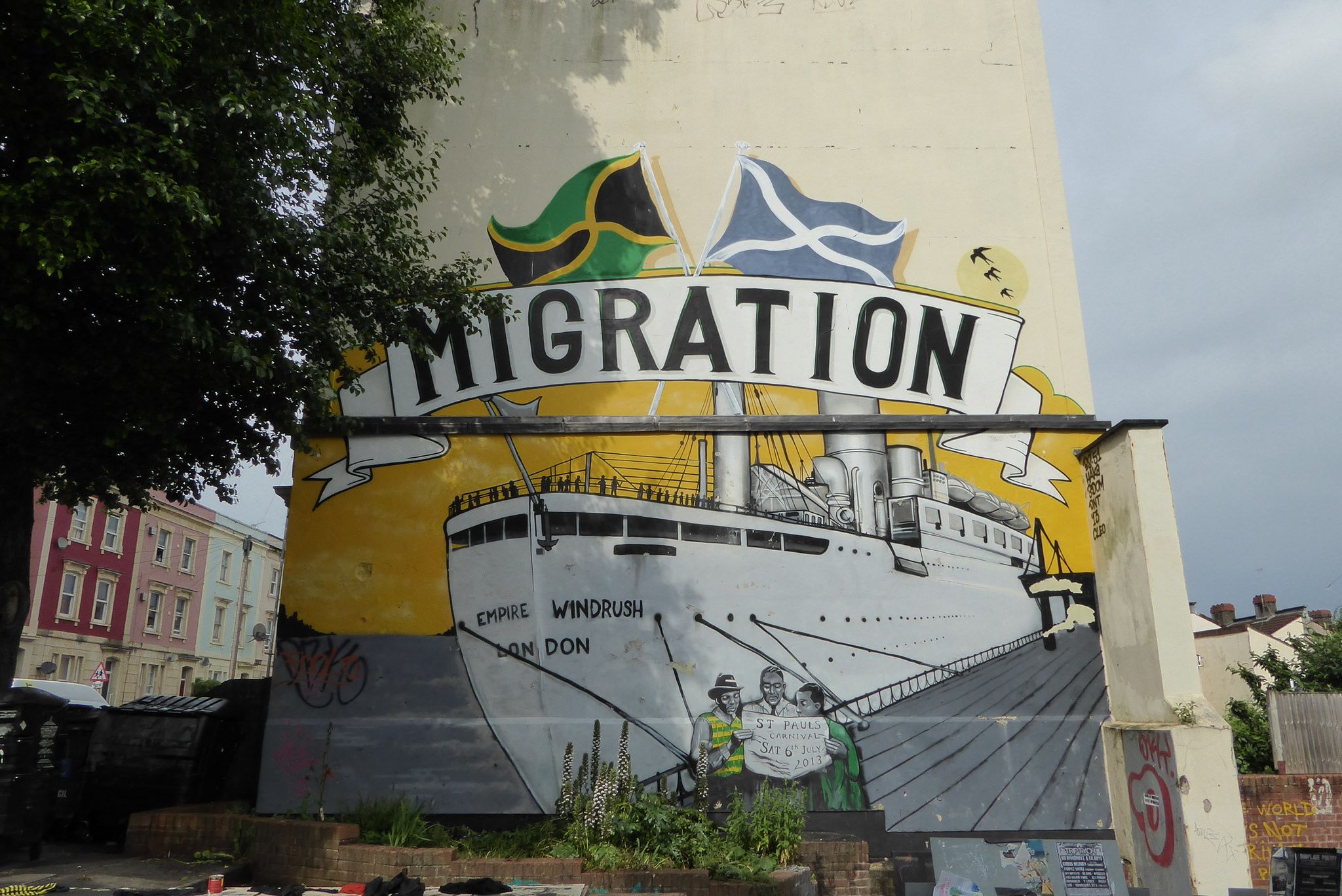 在英國布里斯托(Bristol),一面牆被人畫上了「疾風世代」搭船來到英國的塗鴉。