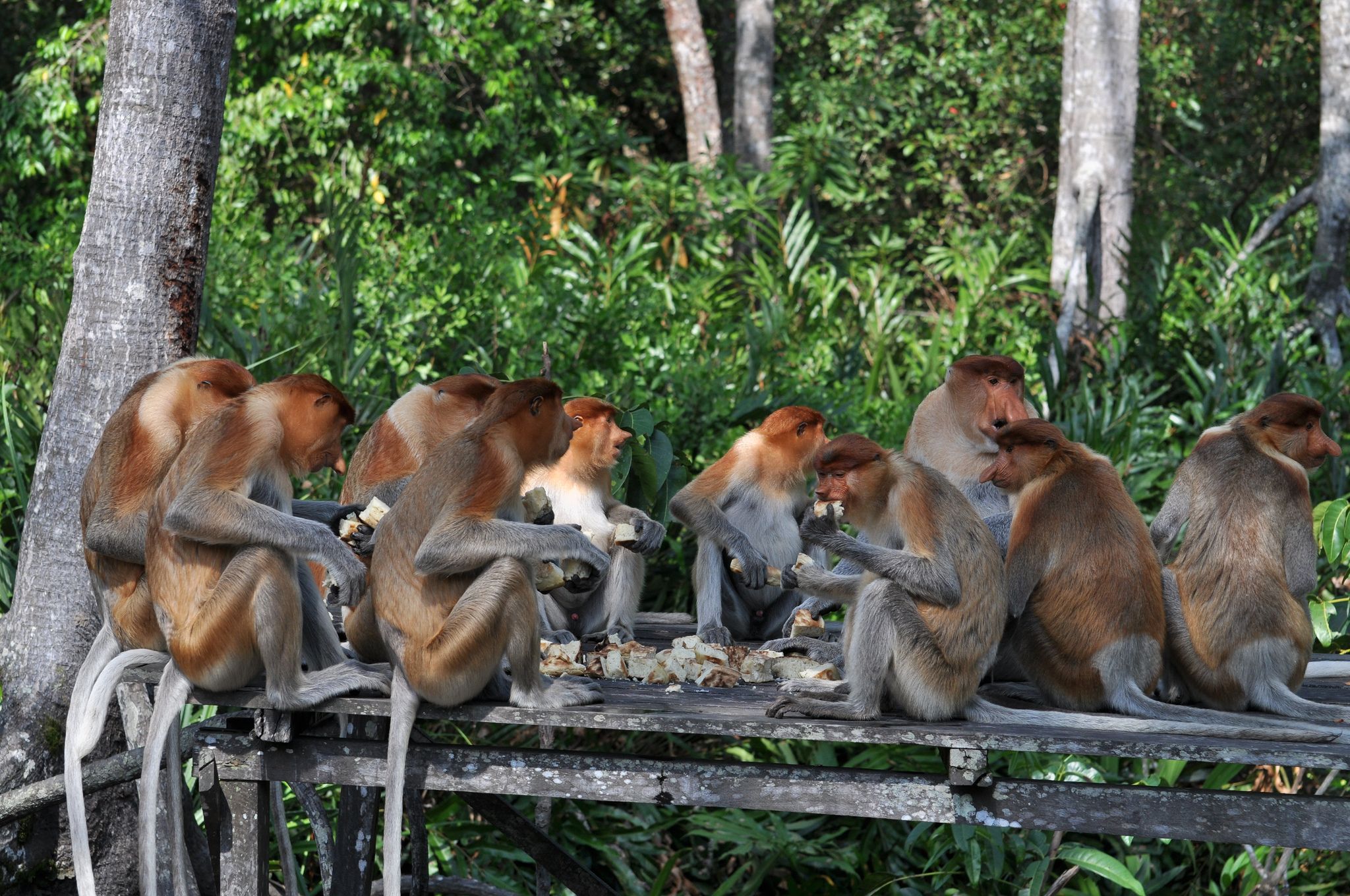 圖為婆羅洲雨林裡,一群猴子開心地圍坐一圈飽餐一頓。研究團隊的拉奇尼認為,婆羅洲雨林很熱鬧,不是聽到雨聲就是猴子的尖叫聲。