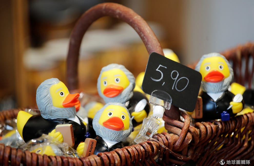 圖為要價 5.9歐元(折台幣約 213元)的馬克思橡皮鴨,在馬克思冥誕前夕,各種紀念品可說紛紛出籠。