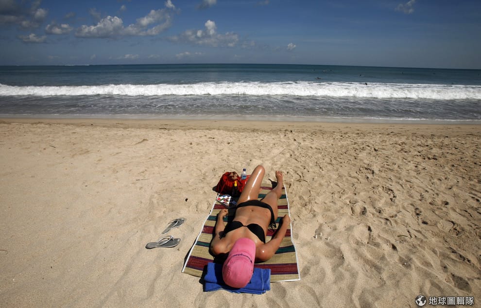在 2008年6月的照片中,一名觀光客正在享受峇里島的夏日陽光。