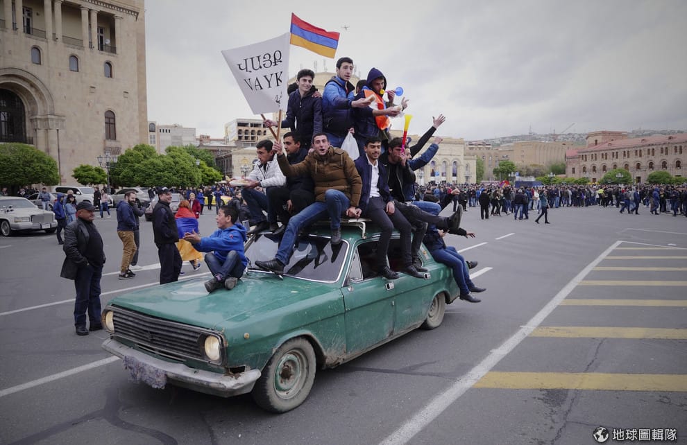 圖為 21號,希望薩奇席恩下台的民眾們坐在車頂上,揮舞著國旗。亞美尼亞是前蘇聯加盟國,在蘇聯解體之後,兩國依舊保持密切的合作關係,薩奇席恩和普亭的政治生涯也很相像。