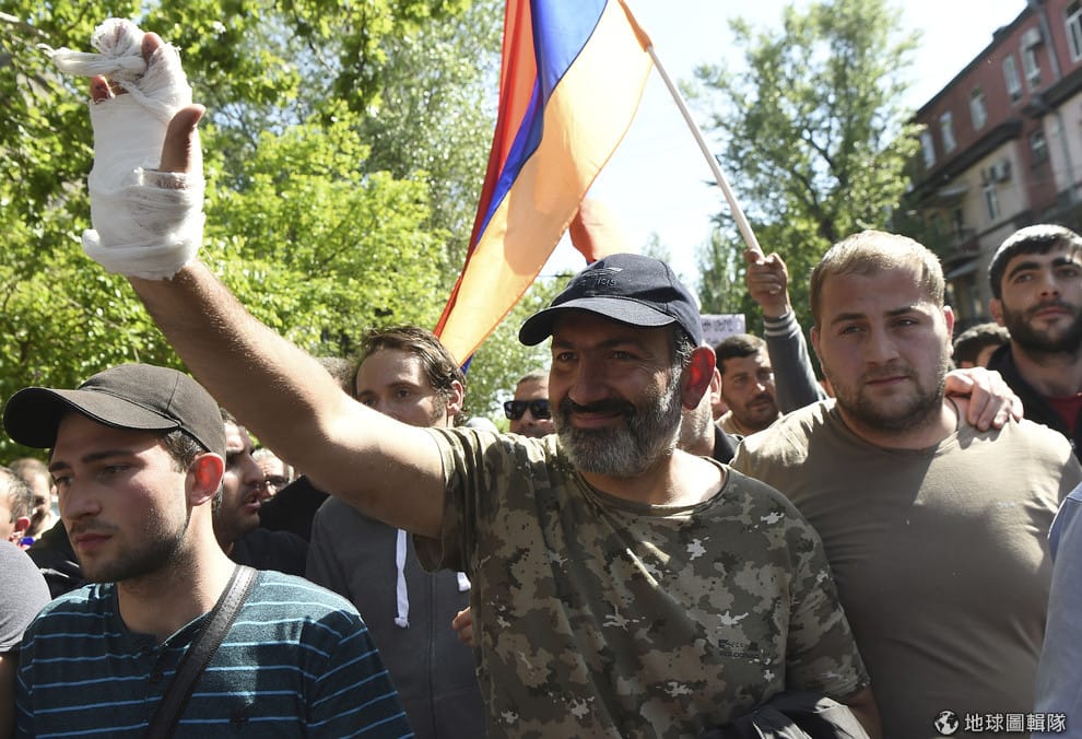 圖為 19號,在首都葉里溫也有不少民眾走上街頭,抗議薩奇席恩卸除總統一職後,又在議會當選總理。左下方身穿短袖迷彩裝、手舉擴音機的就是示威活動召集人帕辛涅。