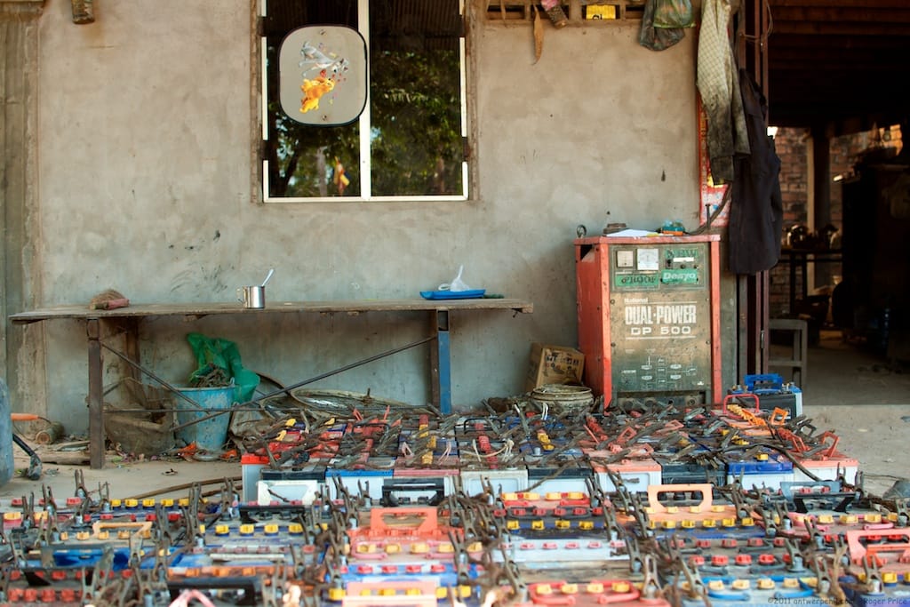 由於鉛電池回收精煉廠距離村莊太近,造成當地人出現鉛中毒的狀況,人們在一開始卻沒注意到這個問題。圖拍攝於 2008年的鉛電池回收工廠。