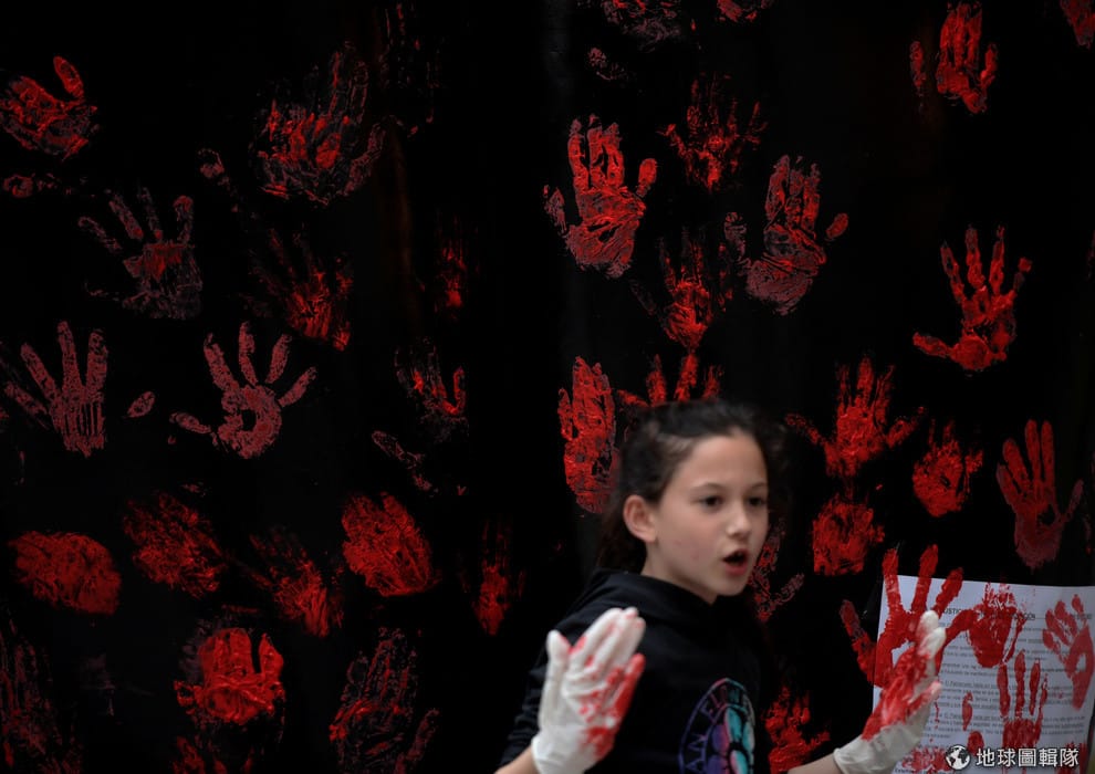 在西班牙西北部的奧維耶多,抗議民眾用血手印表達對法院輕判強暴犯的憤怒。