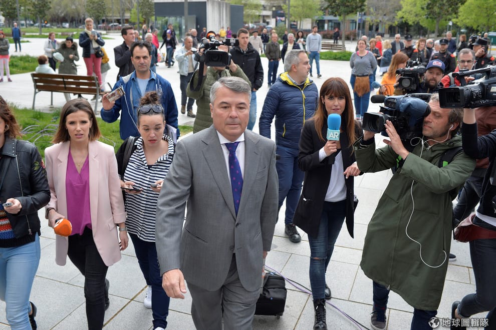 被告律師貝賽拉(Agustin Martinez Becerra,紫色領帶者)在前往法院聆聽宣判的路上,受到大批媒體包圍採訪。