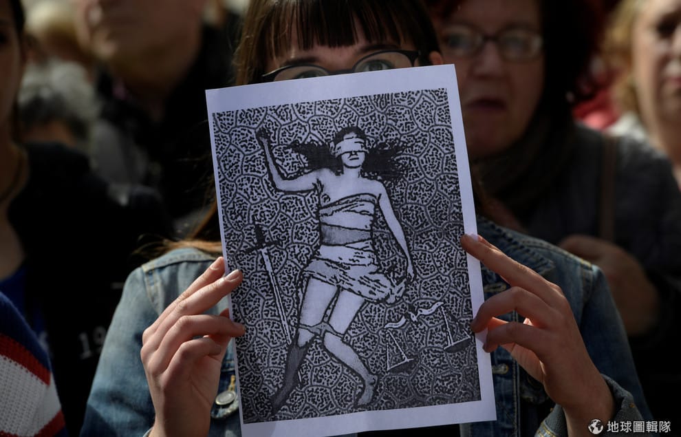 在西班牙阿維萊斯(Aviles)法院外,示威民眾手拿正義女神衣衫不整的圖片,抗議法院輕判輪暴案嫌犯。