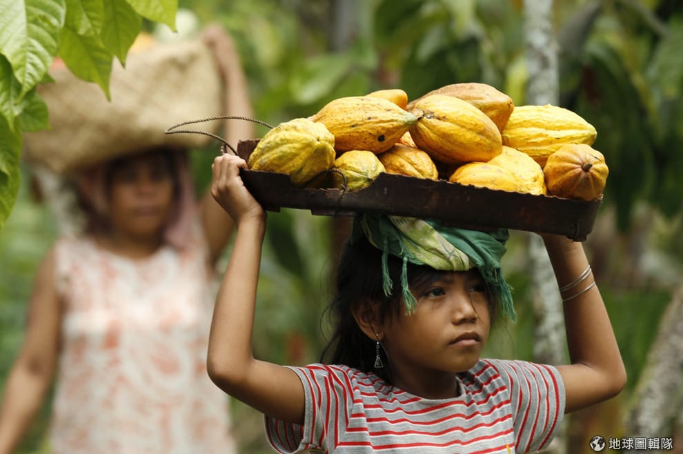 圖為 2010年,在印尼南蘇拉威西省(South Sulawesi),一名小女孩用頭頂著剛採下來的可可果。