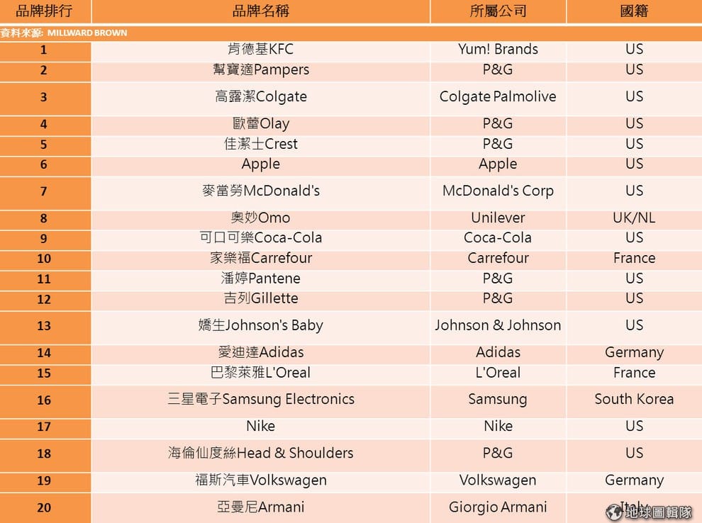明略行(Millward Brown)調查出在中國消費者心目中的前20大品牌,其中美國品牌佔了13家、亞洲品牌僅三星上榜。
