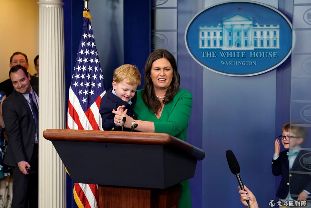 面對伯恩斯坦說川普保鑣搶走病歷一事,白宮表示這是「標準程序」。圖為上個月 26號,白宮新聞秘書桑德斯在「帶著你的小孩去上班日」(take your child to work day)抱著他的兒子接受訪問。