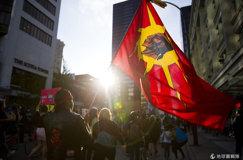 2014年6月,一名示威者拿著代表莫霍克人的旗幟上街抗議。
