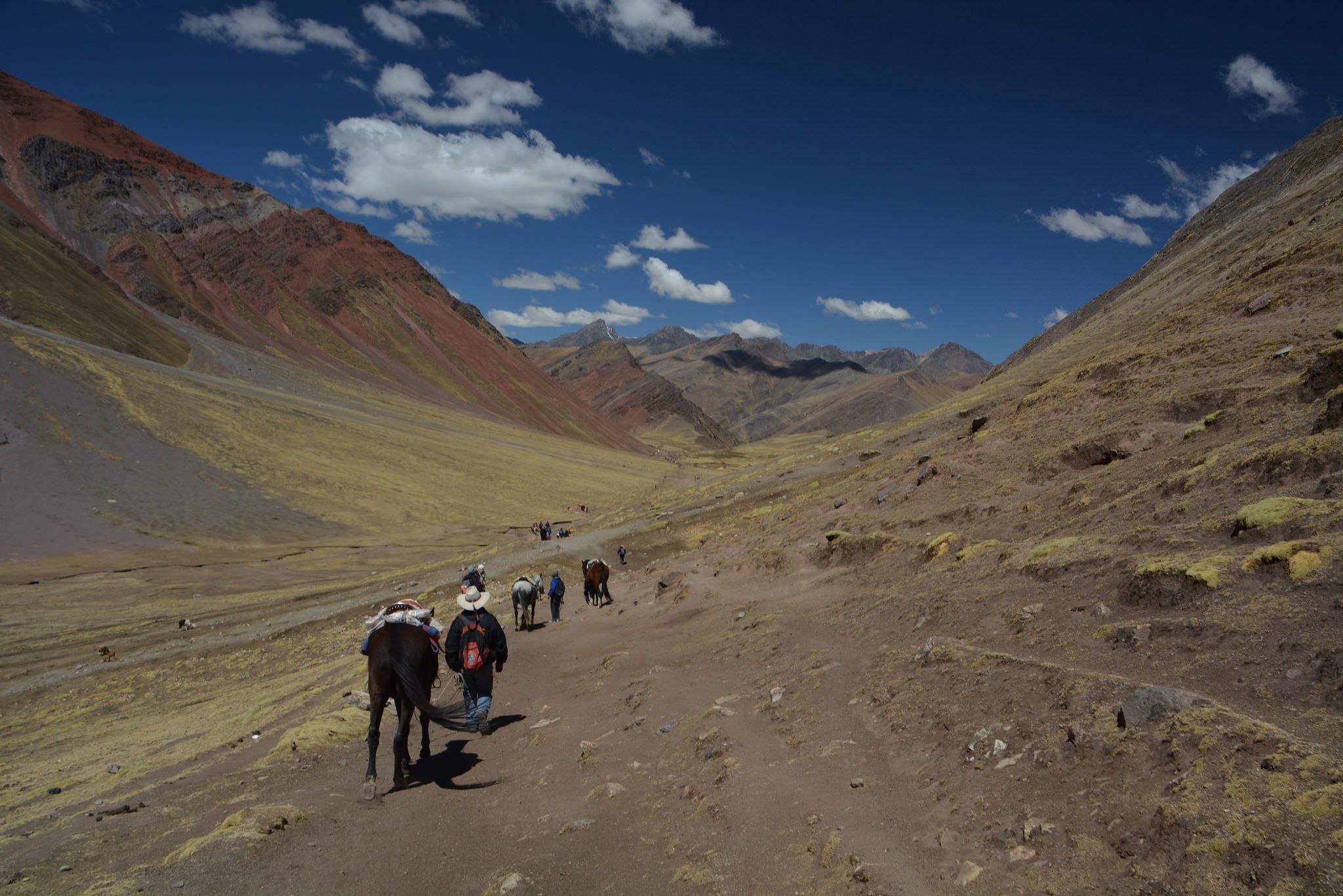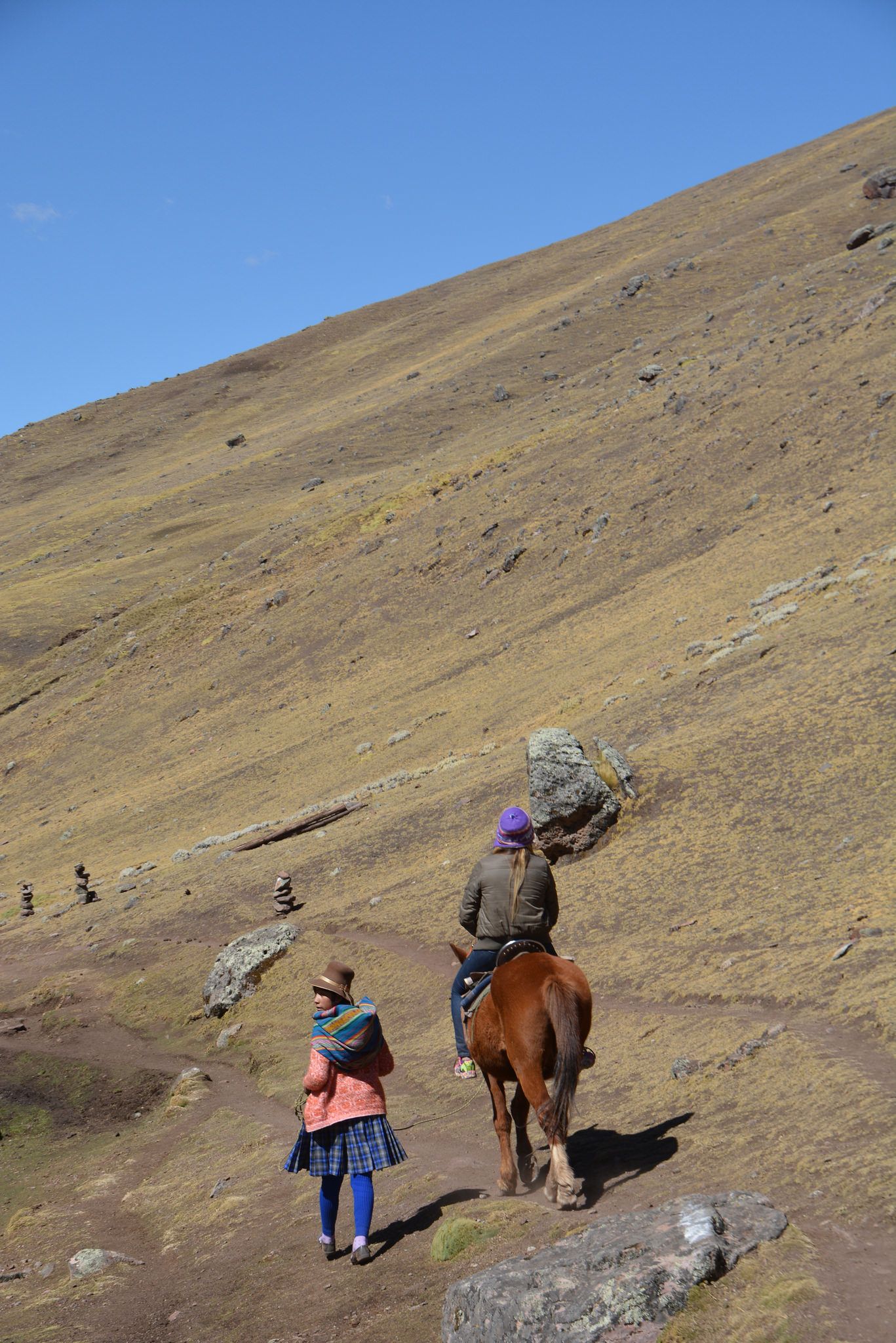 現在在前往彩虹山的路上,不時能看見馬上載著觀光客,而披著傳統羊毛服飾的導遊跟在旁邊。