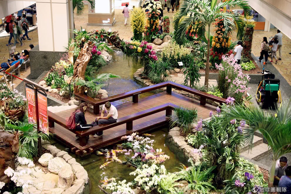 在樟宜機場第二航廈內,旅客可以看到養著錦鯉的水塘,就像在參觀園林建築一樣愜意。