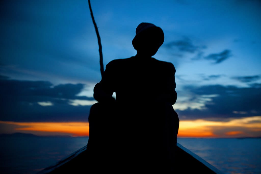 在肯亞維多利亞湖畔,一名男子正在釣魚。