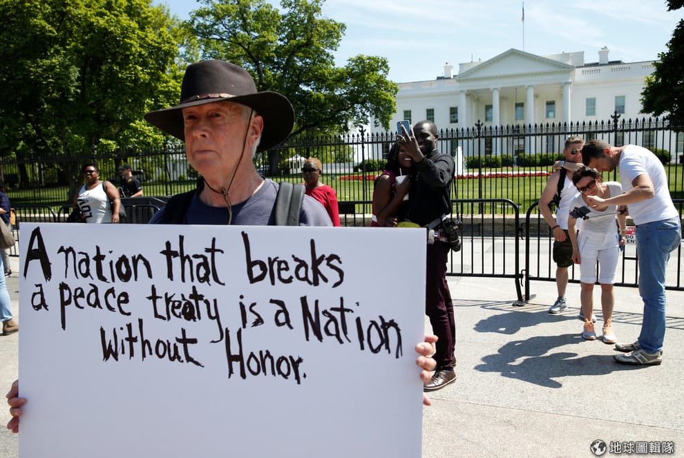 一名抗議美國撤出核協議的民眾站在白宮外,手上舉著寫有「一個打破和平條約的國家是一個沒有榮譽心的國家」字樣的牌子。