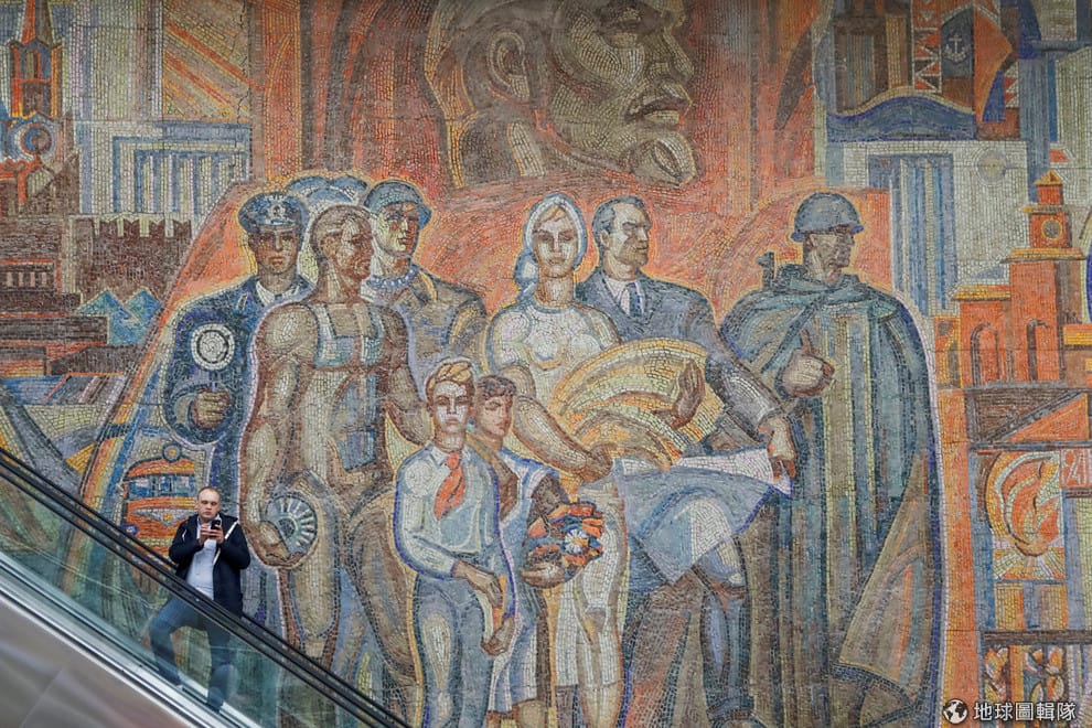 在俄國城市下諾夫哥羅德(Nizhny Novgorod)的地鐵站,一名男子邊玩手機邊搭著手扶梯經過了前蘇聯時期留下的馬賽克壁畫。