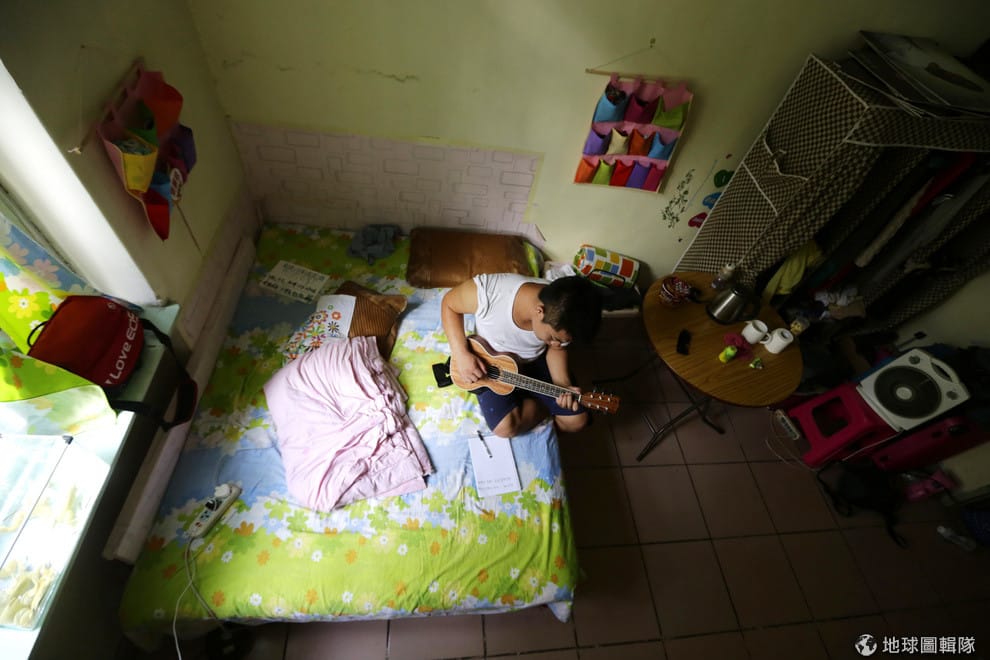 一名街頭藝術家在北京租來的小房間裡練習。到大城市工作的年輕人,往往房租能省則省,和好幾個人一起合租非常普遍。