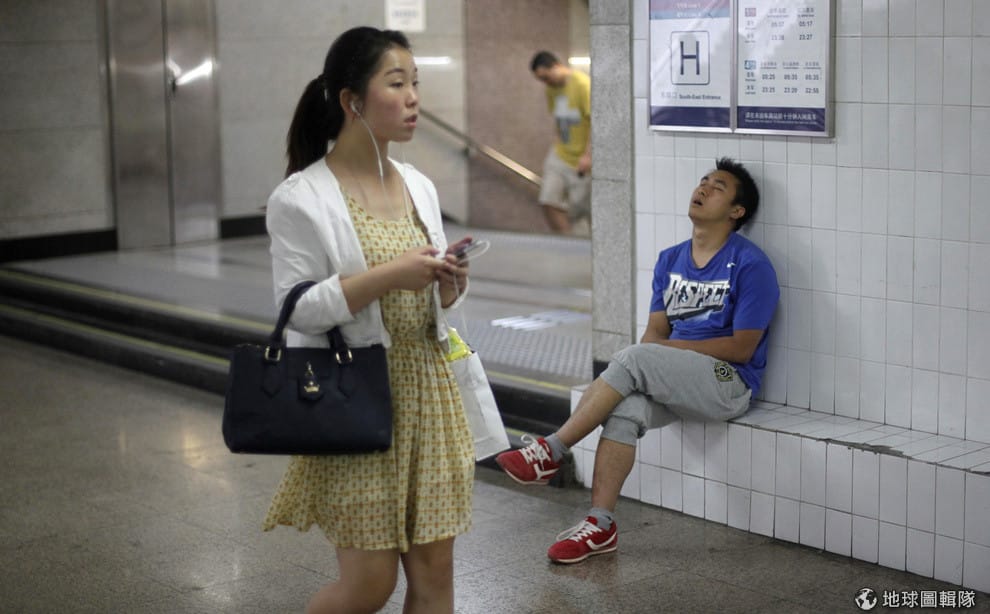 在北京地鐵站,一名女子經過了睡在路邊的男子。與其追求傳統價值認可的成功,中國年輕人寧願走出自己的路。